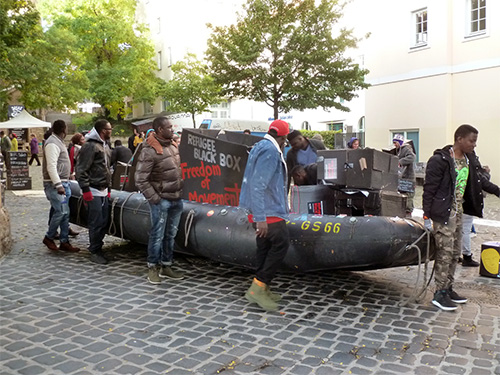 Ab 16:00 Uhr Start Faulloch: Parade durch die Innenstadt: Solidaritätsparade für Geflüchtete durch die Innenstadt mit RefugeeBlackBox-Installation und einem Flüchtlingsboot vom Mittelmeer