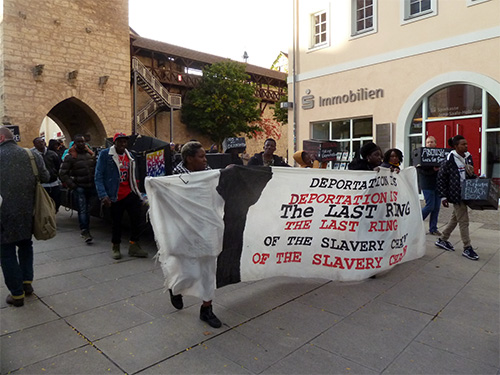 Wir laden alle ein sich unseren Kampf für die Freiheit und Gerechtigkeit für die Geflüchteten anzuschließen. Wir wollen unsere Solidarität der Abschiebementalität und –praxis entgegensetzen, denn Abschiebungen sind nicht nur das letzte Glied der Sklaverei sondern verletzen unsere Grundrechte als Menschen und bedrohen unsere Existenz.