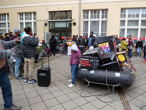 Solidaritätsparade der Flüchtlinge im Vorfeld des 25. Geburtstages und Silberjubiläum von THE VOICE Refugee Forum mit einer „Mittelmeer Refugee Black Box Boot Installation“ http://thevoiceforum.org/node/4661