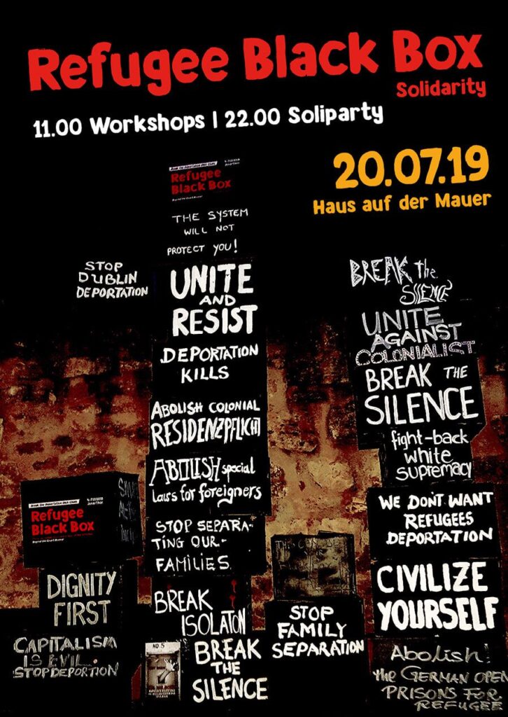 Vereint treten wir auf nicht nur gegen Abschiebungen sondern auch gegen jedwede soziale Ausgrenzung. Unsere Solidarität und Zusammenschluss bringen wir mit der Refugee Black Box zum Ausdruck.